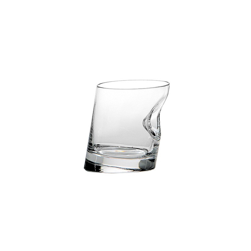 The inclined form of the glass with its recess towards the top invites to hold it easily and also stops the ice-cube from coming up.