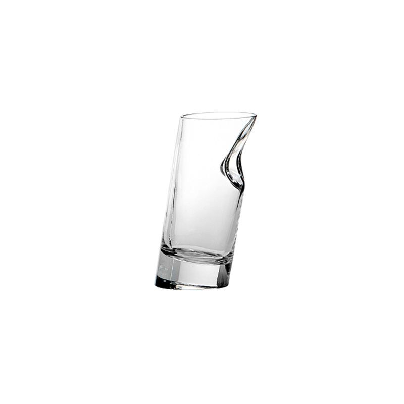 The inclined form of the glass with its recess towards the top invites to hold it easily and also stops the ice-cube from coming up.